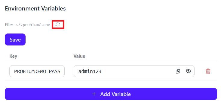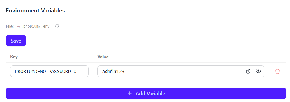Probium prioritizes security by storing sensitive data, such as passwords, locally on your computer rather than on its servers. These values are stored in a file named .env in your home directory (e.g., C://Users/<Your username>/.probium/.env on Windows).